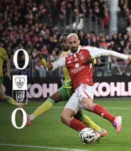 L’arbitre siffle la première période. Nantes se montre joue haut mais n’arrive pas à se procurer des occasions. Brest a eu trois occasions bien stoppées par Lopes.